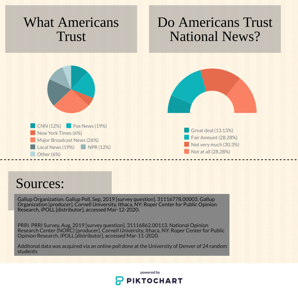 Some college students, on the other hand, have great trust in journalists from national news organizations like The New York Times or The Wall Street Journal. DU 2nd-year student Blaine Tracy said, “I usually get my news from them [The New York Times], I feel they are one of the most objective sources.”