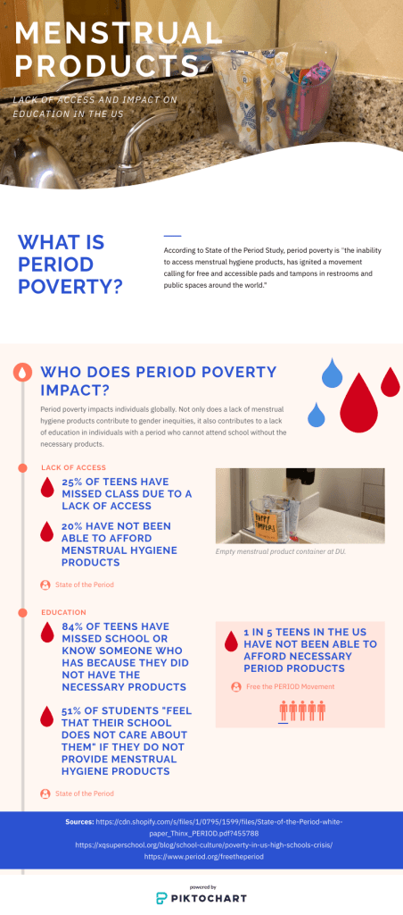 According to the study, State of the Period, “25% of teens have missed class because of lack of access to period products, 20% of teens have struggled to afford period products or were not able to purchase them at all, and 84% of teens have either missed class time or know someone who has missed class time because they did not have access to period products.”