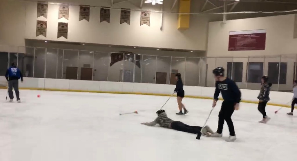 Take hockey and remove the cheering crowd, the ice skates, and the division one athletes. Insert sneakers, sweatpants, and screaming college kids with very little coordination. Lose the puck and replace it with a small orange soccer ball. Instead of three, twenty-minute periods, there are two, eighteen-minute halves. Five people on the ice per team. One sixty second halftime and no timeouts.
