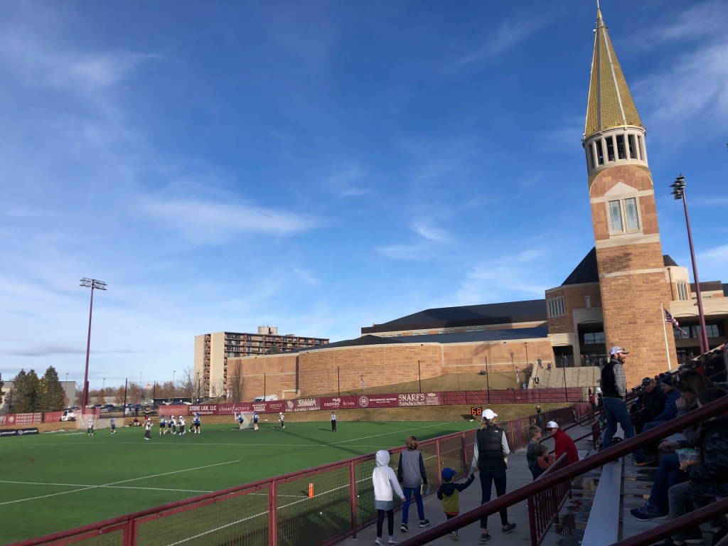 The sun shines down on Peter Barton Lacrosse Stadium as the pioneers take the ball down the field. [Photo by Maki Jenner]